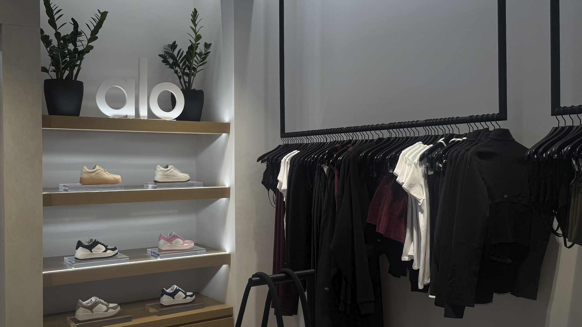 Interior comercial de estética futurista y cálida. Un cielo facetado organiza el espacio, mientras un perímetro de nichos retroiluminados exhibe el producto sobre un pavimento de piedra oscura que multiplica reflejos. La iluminación LED y los acabados metálicos satinados consolidan un lenguaje tecnológico, preciso y acogedor.