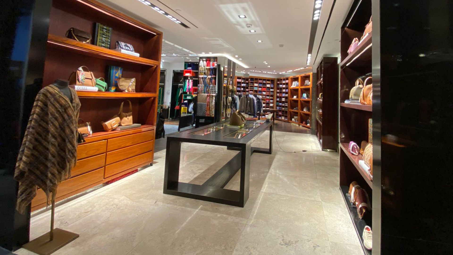 Interior comercial de estética futurista y cálida. Un cielo facetado organiza el espacio, mientras un perímetro de nichos retroiluminados exhibe el producto sobre un pavimento de piedra oscura que multiplica reflejos. La iluminación LED y los acabados metálicos satinados consolidan un lenguaje tecnológico, preciso y acogedor.