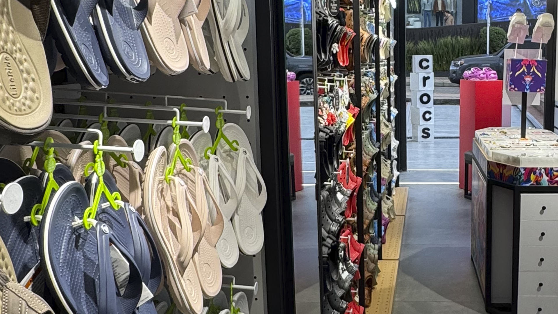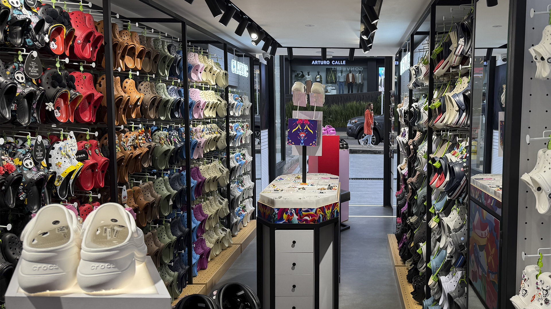 Interior comercial de estética futurista y cálida. Un cielo facetado organiza el espacio, mientras un perímetro de nichos retroiluminados exhibe el producto sobre un pavimento de piedra oscura que multiplica reflejos. La iluminación LED y los acabados metálicos satinados consolidan un lenguaje tecnológico, preciso y acogedor.