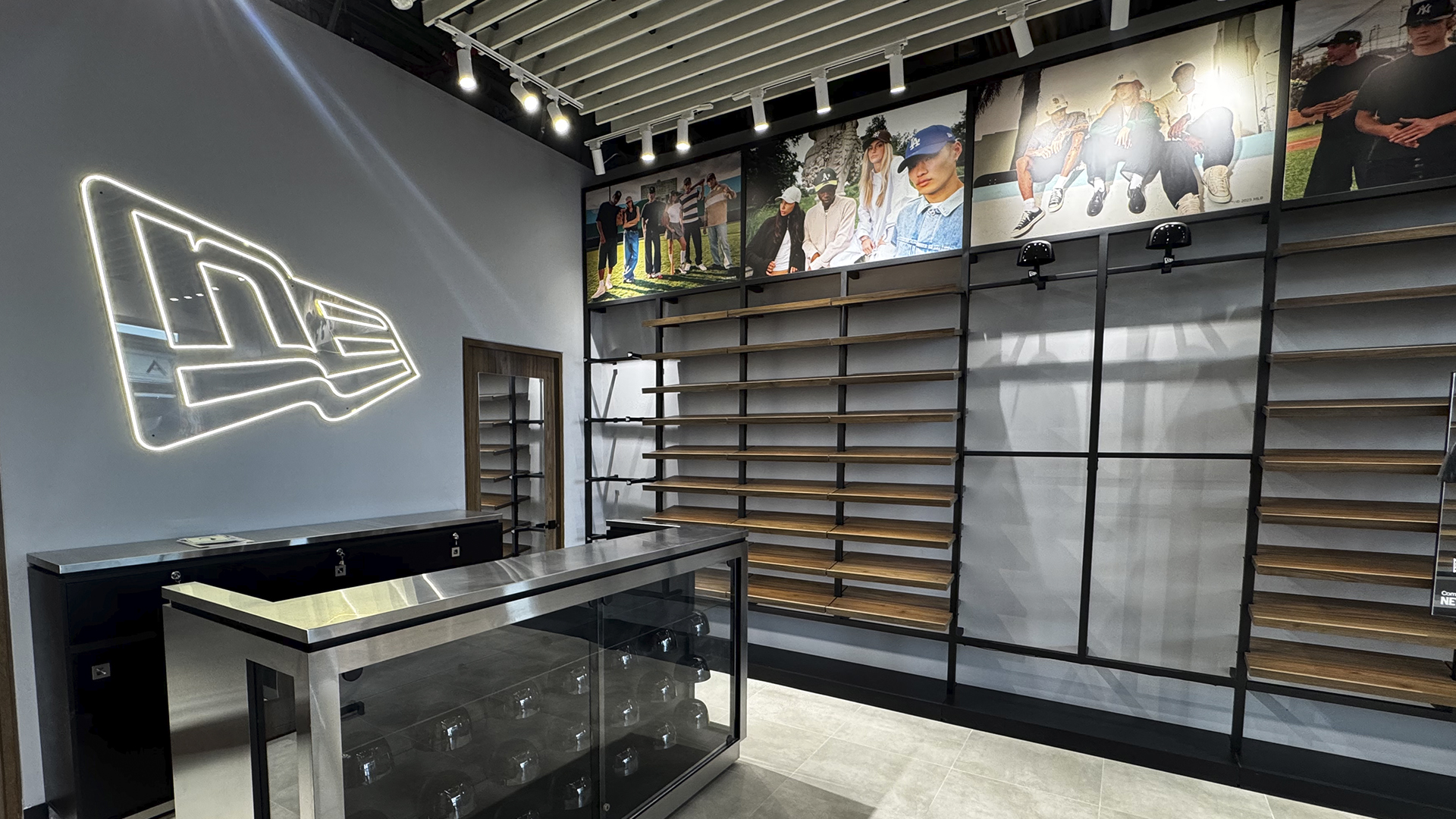 Interior comercial de estética futurista y cálida. Un cielo facetado organiza el espacio, mientras un perímetro de nichos retroiluminados exhibe el producto sobre un pavimento de piedra oscura que multiplica reflejos. La iluminación LED y los acabados metálicos satinados consolidan un lenguaje tecnológico, preciso y acogedor.