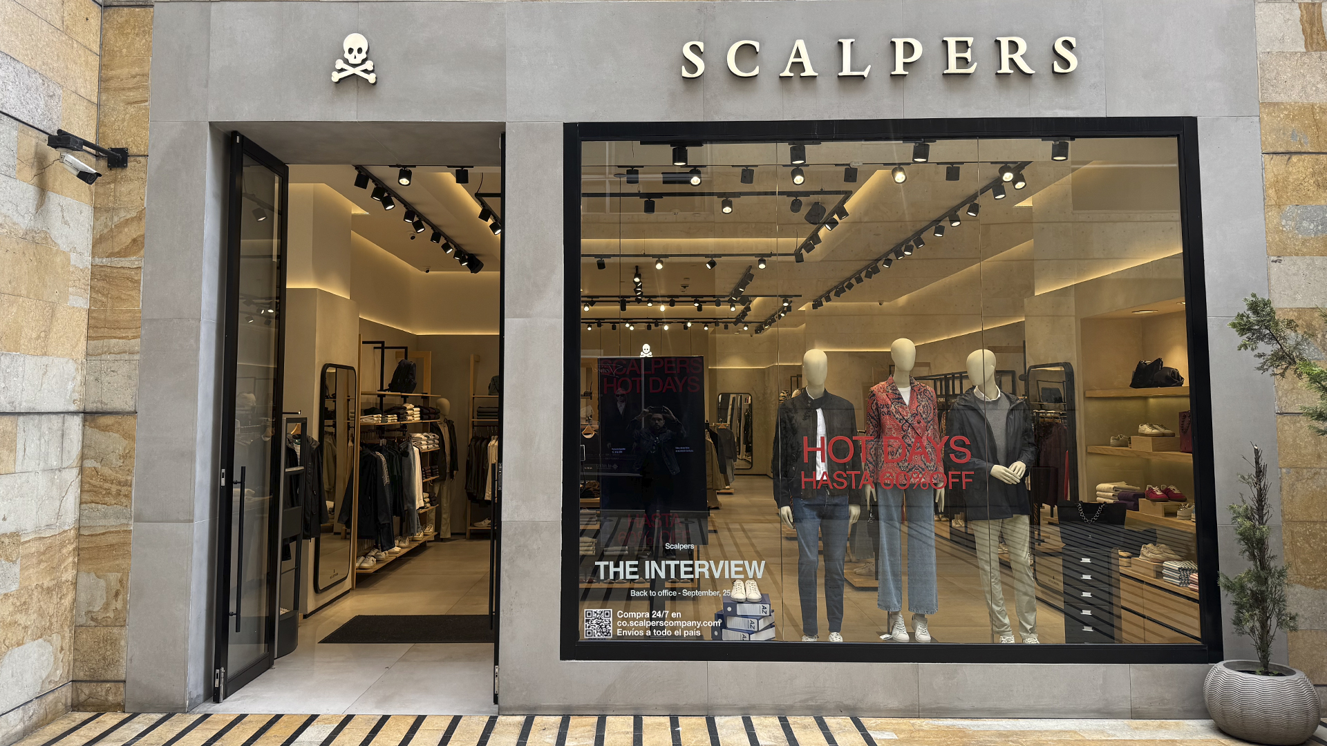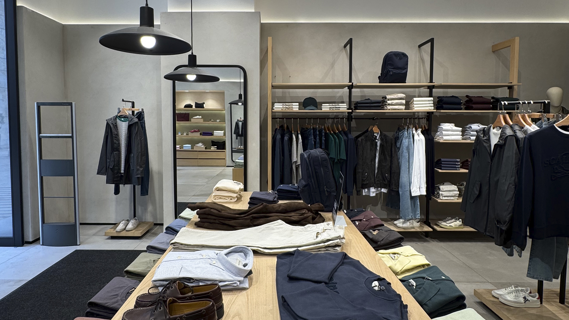 Interior comercial de estética futurista y cálida. Un cielo facetado organiza el espacio, mientras un perímetro de nichos retroiluminados exhibe el producto sobre un pavimento de piedra oscura que multiplica reflejos. La iluminación LED y los acabados metálicos satinados consolidan un lenguaje tecnológico, preciso y acogedor.